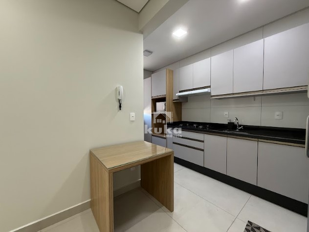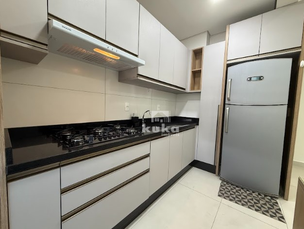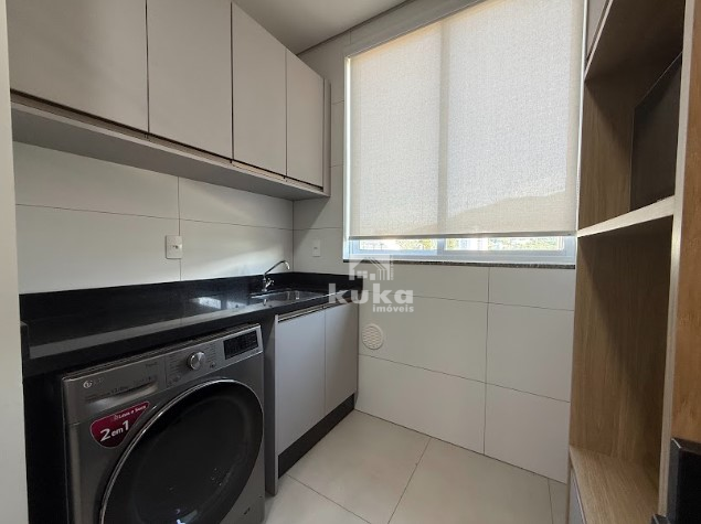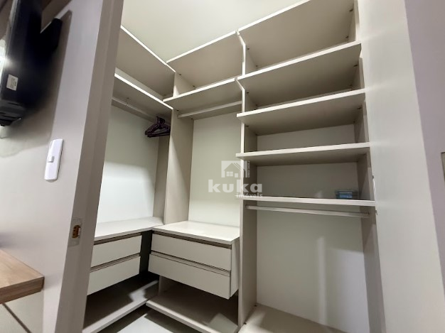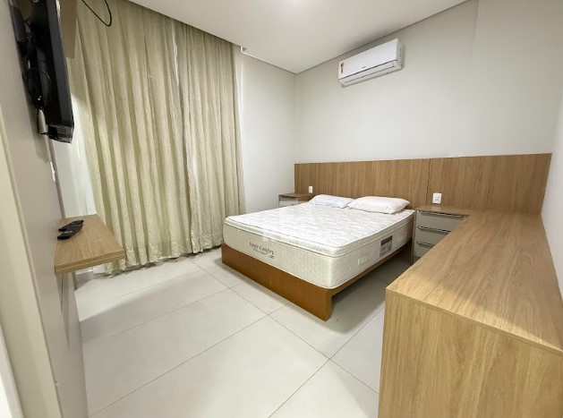 Cozinha sob medida com fogão cooktop, depurador de ar, geladeira e micro-ondas; Móveis de lavanderia com máquina lava e seca; Painel com Tv na sala; Suíte com closet, armários, cama, tv e ar-condicionado, além do banheiro completo; Cortinas em todos os cômodos.
