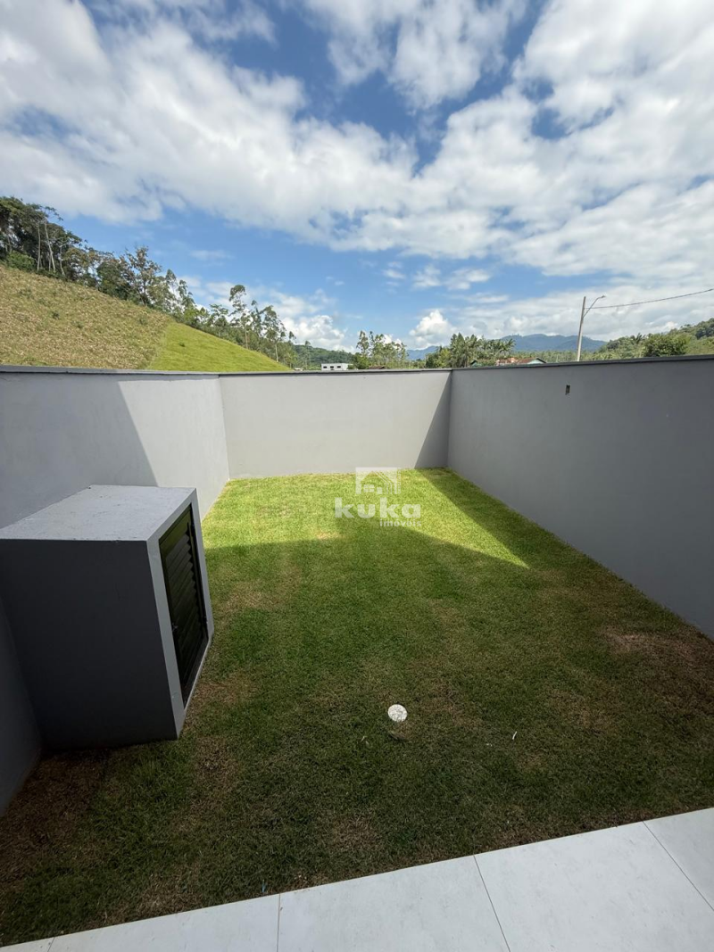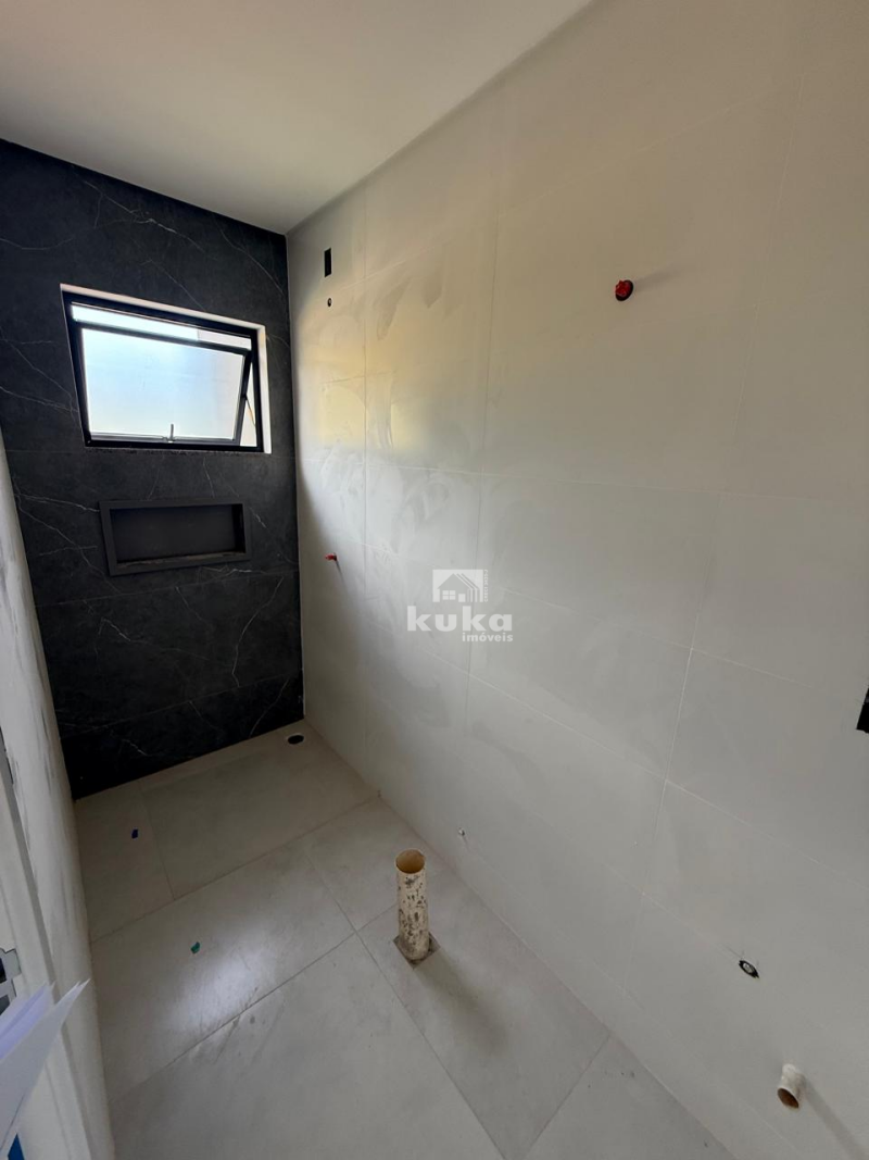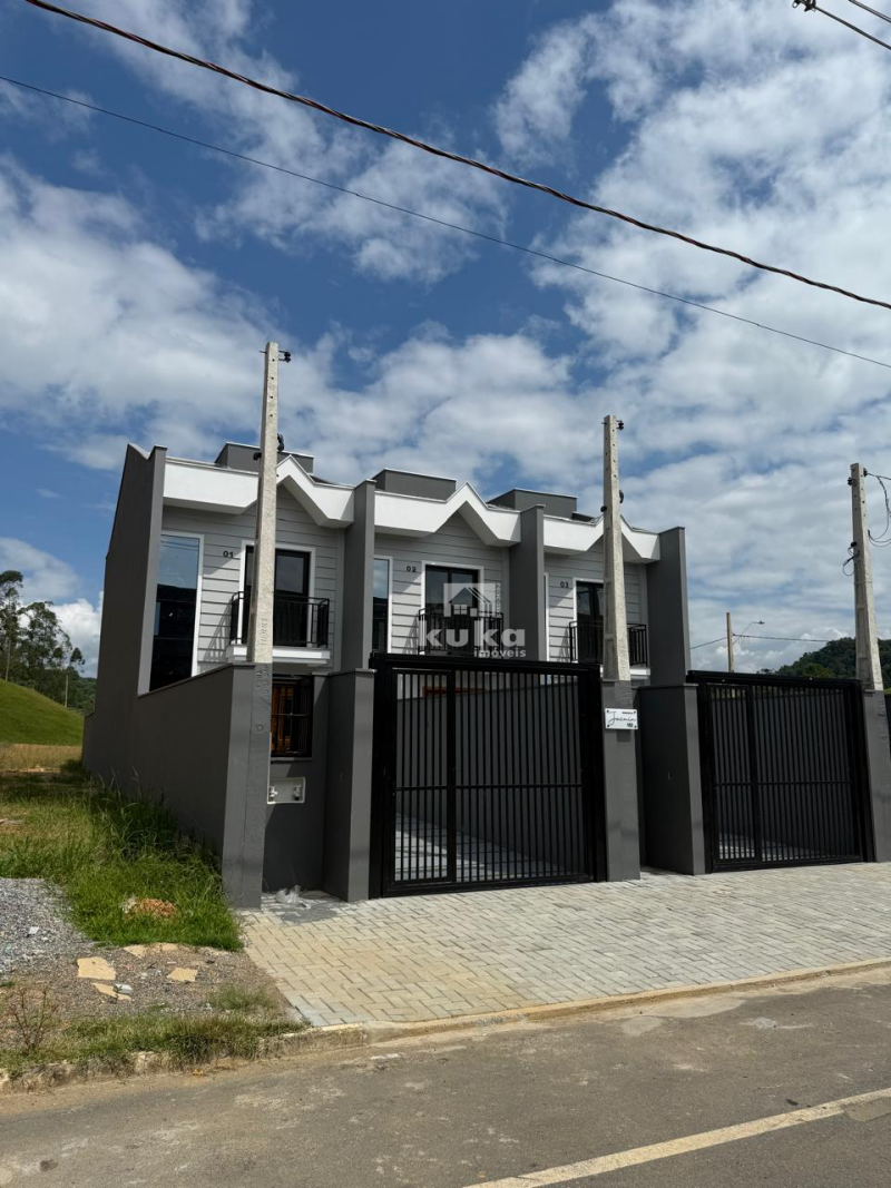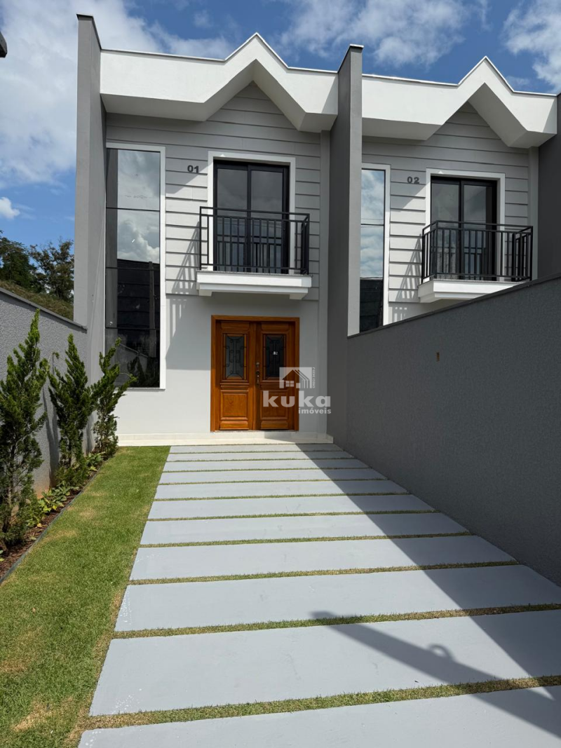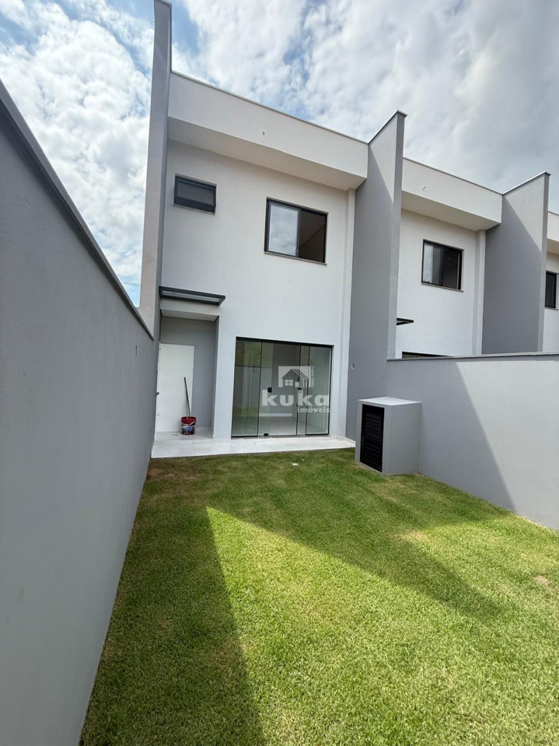 Casa geminada possui 2 suítes, sala de estar, cozinha, área de serviço, 1 bwc social, 1 lavabo, 1 vaga de garagem, jardim, quintal, alvenaria, murado.
