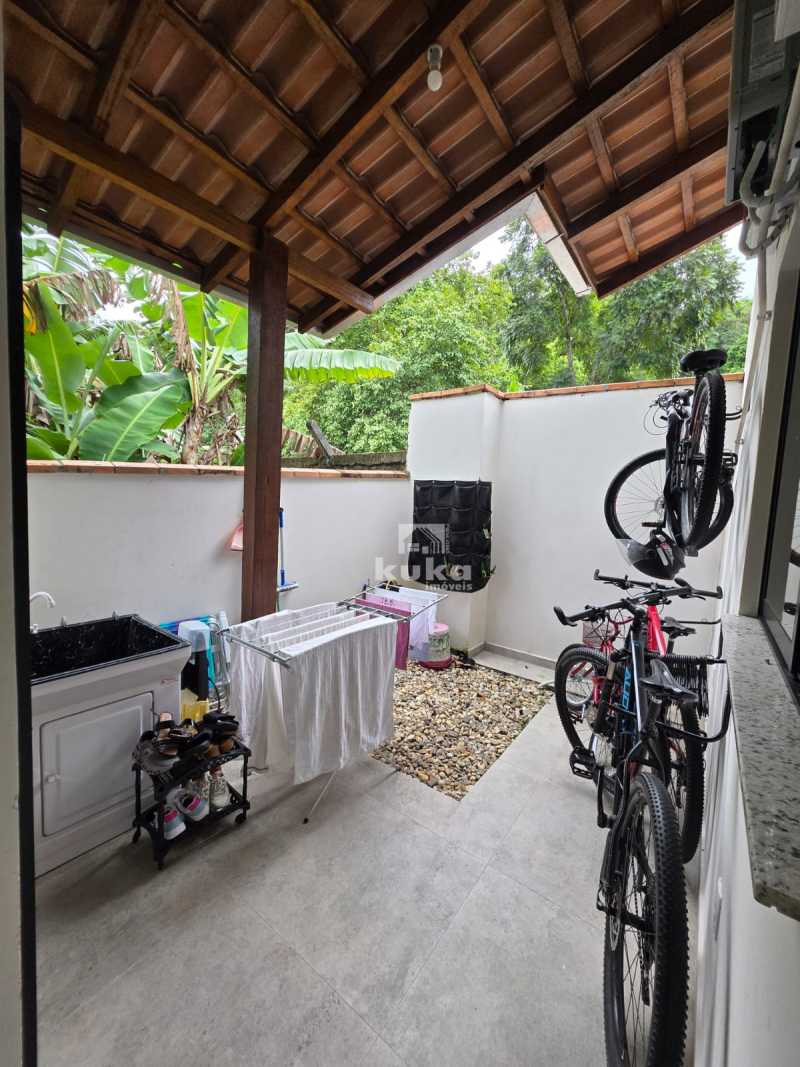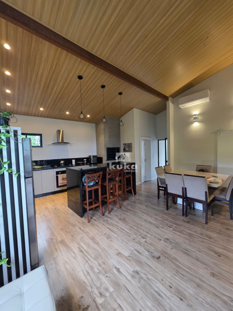 1 suíte + 2 dormitórios, sala de estar, sala de jantar, copa, área de serviço, 2 banheiros, 2 vagas de garagem, varanda, churrasqueira, jardim, quintal, alvenaria, murado.
